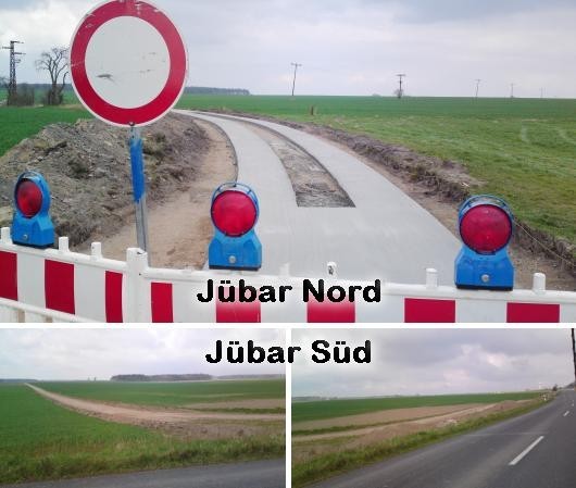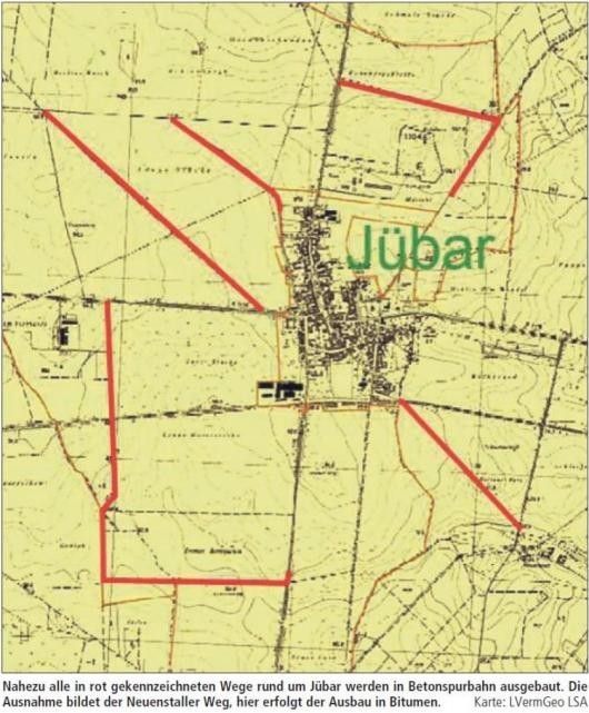 Für 1,1 Millionen Euro werden sieben Wege rund um Jübar mit Asphalt und Beton saniert. Zur Zeit sind schwere LKW mit Sand, Beton, Asphalt und anderen Baumaterialien in unserer Gemeinde unterwegs, um die Teilbaustellen zum ländlichen Wegebau der Maßnahme 'Jübar Feldlage' zu versorgen. Die ersten Betonbahnen sind gelegt und müssen nun aushärten. Die Absperrungen signalisieren: Befahren oder Betreten streng verboten! Wer möchte schon seine Fuß- oder Handabdrücke für 30 Jahre oder mehr im Beton verewigt wissen?