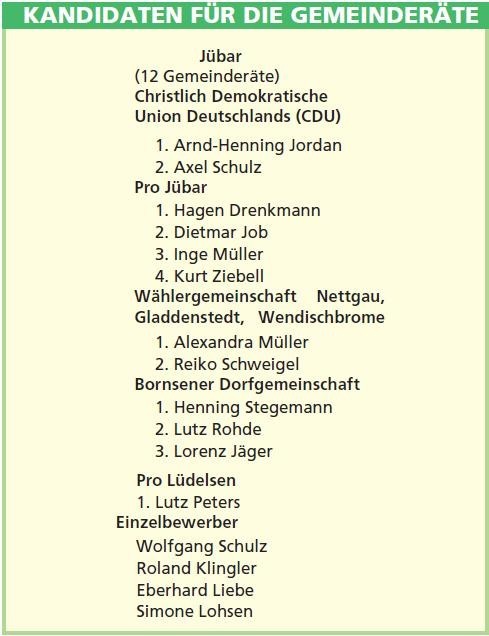 Für die Gemeinde Jübar haben sich 16 Kandidaten zur Ratswahl aufgestellt. Es werden insgesamt 12 Gemeinderäte gewählt. Die Auflistung ist alphabetisch geordnet.