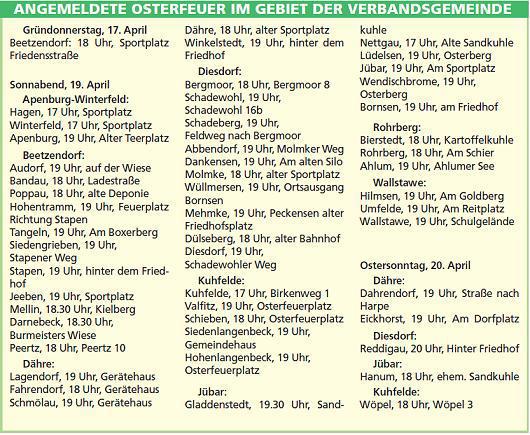 31. März - Gemeinde Jübar, Wahlvorschläge für die Gemeinderatswahl sind bei der Gemeindewahlleiterin (Frau Christiane Lüdemann, Beetzendorf) einzureichen. Die Einreichungsfrist endet am 55. Tage vor der Wahl (31.3.2014) um 18:00 Uhr.