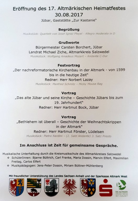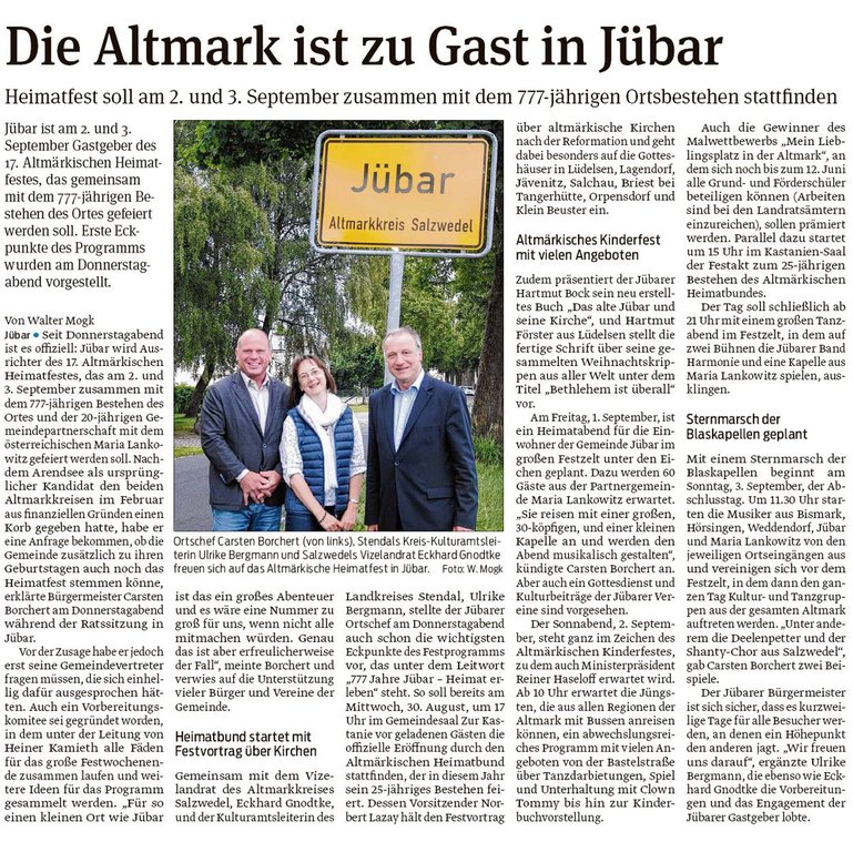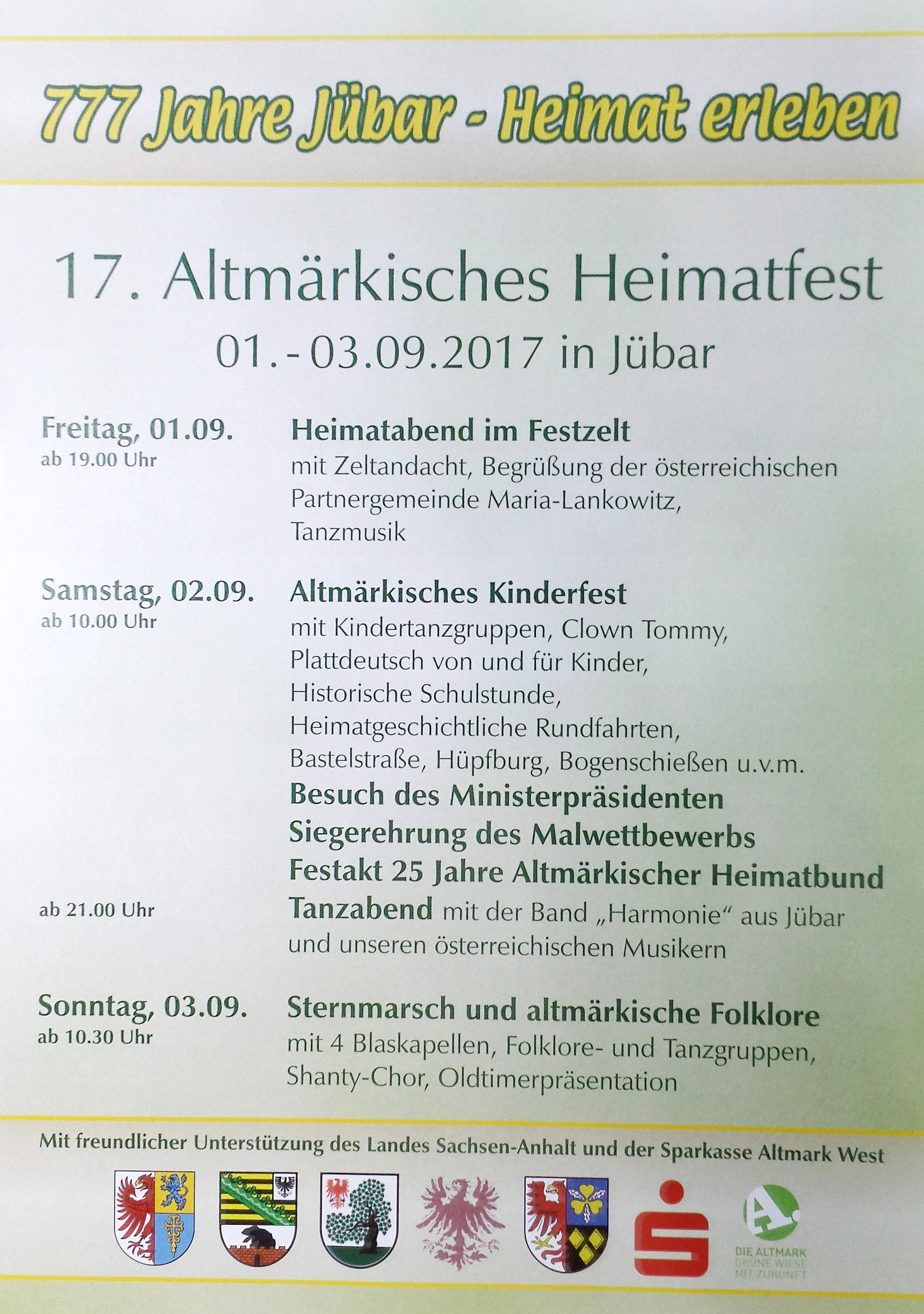 Nun können die Plakate aufgehängt, die Flyer verteilt und ausgelegt werden. Die Vorboten zum '17. Altmärkischen Heimatfest' und '777 Jahre Jübar' zeigen Details zum dreitägigen Ablauf auf. Am Freitag dem 1. September wird auf dem Festzelt das 20-jährige Bestehen der Gemeindepartnerschaft 'Jübar - Maria-Lankowitz' gefeiert. Der darauf folgende Sonnabend steht tagsüber im Zeichen der Kinder. Das 'Altmärkische Kinderfest' erwartet viele junge und ältere Gäste. Abends wird auf dem Festzelt getanzt. Der Sonntag beginnt festlich mit einem Sternmarsch unserer Ortsteile Richtung Festplatz. An allen Tagen stehen genügend ausgeschilderte Parkplätze zur Verfügung. Auch wird gut für das leibliche Wohl gesorgt werden.