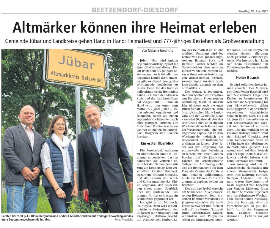 die Vorbereitungen auf unser Altmärkisches Heimatfest und das Jubiläum der Partnergemeinde sowie 777 Jahre Jübar nähern sich dem Ende.