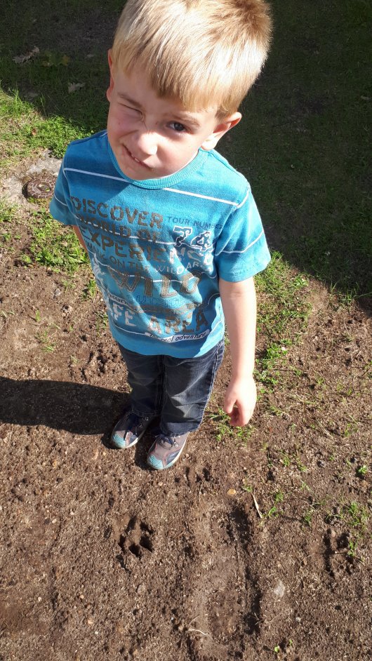 Nettgau - Da staunte der 4jährige Neo Cosmo Kappl nicht schlecht als er vom Kindergarten nach Hause kam. In der Rasensaat vor seinem Zuhause sind viele große Spuren eines Tieres (sogar nach dem starken Regenguss) zu sehen. Sie verlaufen an einigen Grundstücken auf der Hauptstraße nah an den Zäunen entlang in einer geraden Spur. Die Größe läßt schon einen Wolf vermuten. Internetrecherchen seines großen Bruders Maxim Schreib lassen das etwas bezweifeln, da Wolfsspuren etwas schmaler sind (die Vorderkrallen stehen enger zusammen). Doch sicher sind sich die beiden Brüder nicht! Sie haben das Tier ja nicht selbst gesehen. Müssen sie nun Angst vorm Wolf haben???