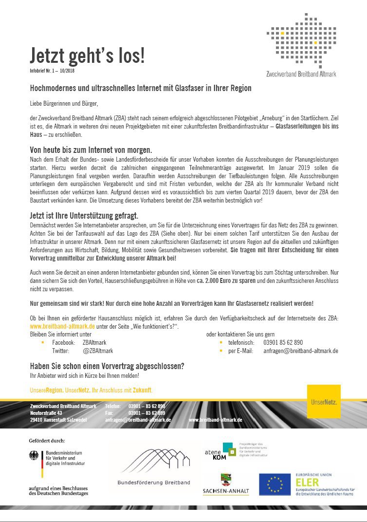 der Zweckverband Breitband Altmark (ZBA) steht nach seinem erfolgreich abgeschlossenen Pilotgebiet „Arneburg“ in den Startlöchern. Ziel ist es, die Altmark in weiteren drei neuen Projektgebieten mit einer zukunftsfesten Breitbandinfrastruktur – Glasfaserleitungen bis ins Haus – zu erschließen.