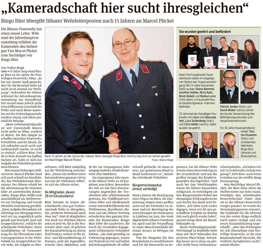 20200128 Volksstimme - Jübar - Ringo Büst gibt Feuerwehrleiterposten an Marcel Plicket ab (Walter Mogk)