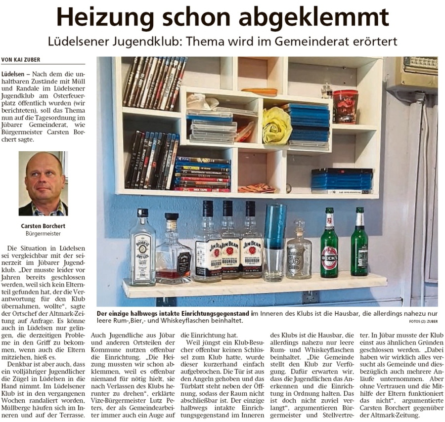20200128 Altmark Zeitung - Lüdelsen - leere Spirituosenflaschen im Jugendklubraum (Kai Zuber)