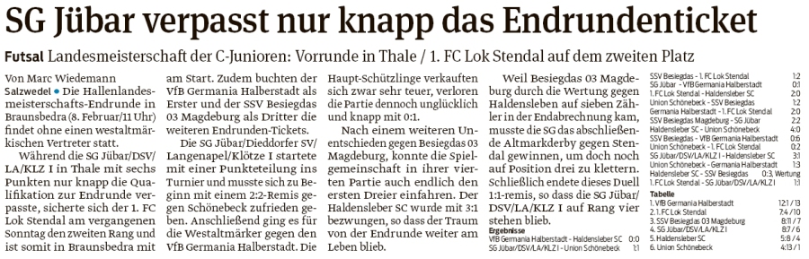 20200129 Volksstimme - Jübar - SG Jübar/DSV/LA/KLZ I in Thale mit sechs Punkten (Marc Wiedemann)