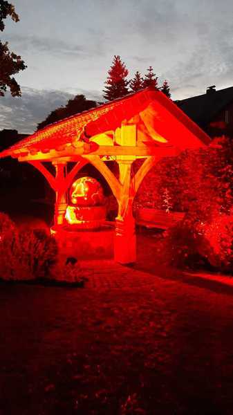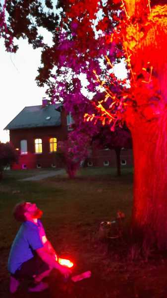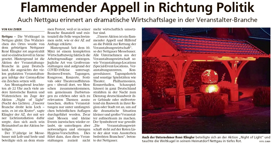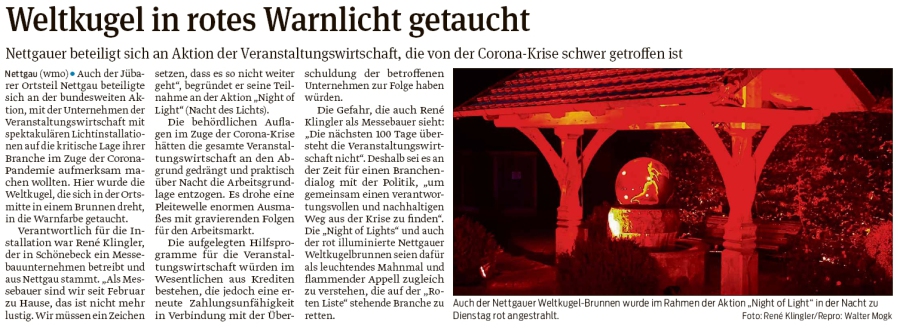 Nettgau - 'Night of Light' eine Aktion von Künstlern und Veranstaltern etc. wurde zur Nacht vorab zum 22. Juni in Nettgau von dem Veranstalter, Design und Messebauer René Klingler aus Schönebeck zelebriert. Publikum aus seinem Heimatdorf stellte sich schnell ein und zeigte hohes Interesse. Mit colorierenden LED-Scheinwerfern wurde die zentrale Dorfeiche und der Weltbrunnen beleuchtet. Das prägnante Rot signalisierte die dramatische Lage der Veranstaltungswirtschaft in der Coronakrise.