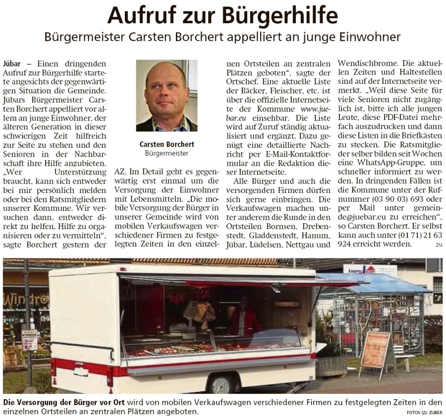20200321 Altmark Zeitung - Gemeinde - Aufruf zur Bürgerhilfe (Kai Zuber)