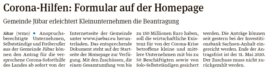 20200331 Volksstimme - Gemeinde Jübar - Corona-Hilfen Formular auf WebSite (Walter Mogk)