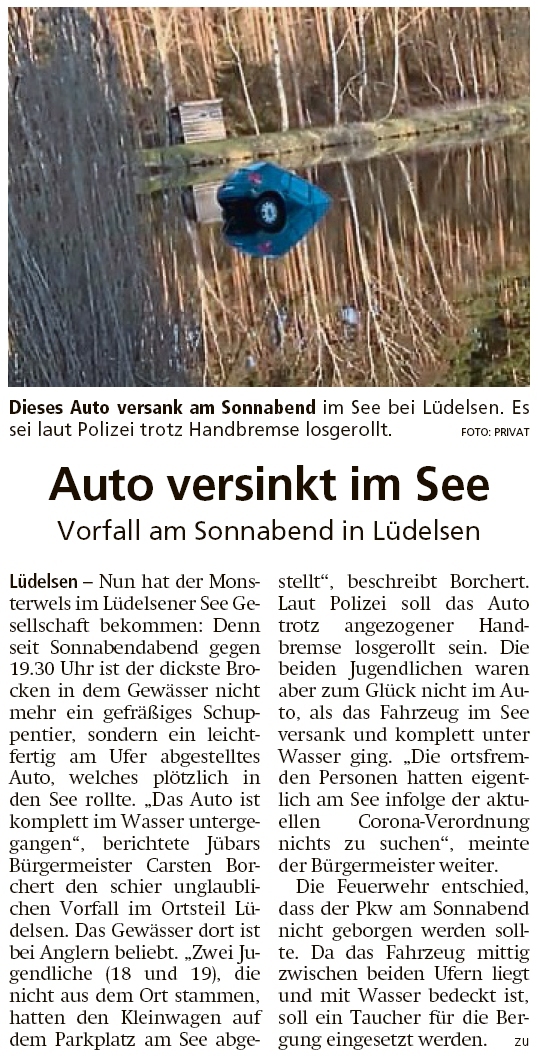20200407 Altmark Zeitung - Lüdelsen - Golf mit Traktorwinde aus dem See gerettet (Kai Zuber)
