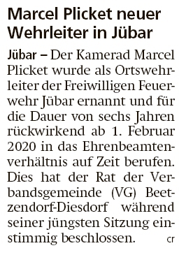 20200512 Altmark Zeitung - Jübar - Marcel Plicket als Wehrleiter bestätigt (Christian Reuter)