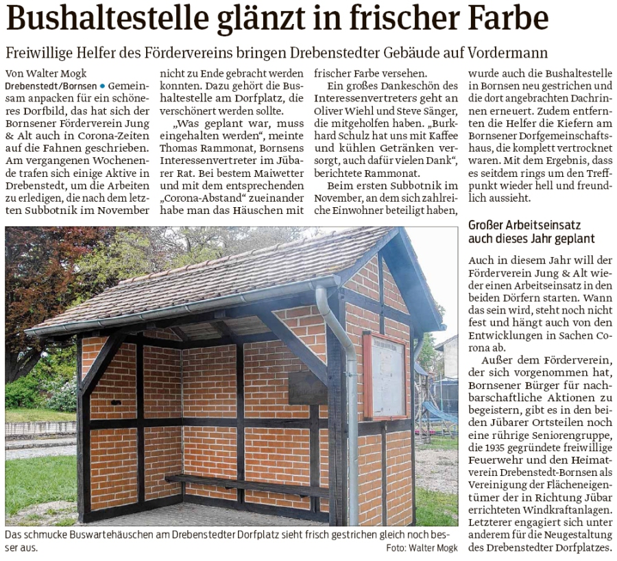 Förderverein Jung & Alt - Was letztes Jahr auf unserem Subbotnik nicht geschafft wurde haben wir an diesem Wochenende fertig gemacht! Denn, was geplant war muss eingehalten werden. Die Restverschönerungen, wie Farbe und Bild wurden bei bestem Mai-Wetter und mit entsprechendem 'Corona-Abstand' zueinander am Buswartehäuschen angebracht. Ein großes Dankeschön geht an Oliver Wiehl und Steve Sänger, die kräftig mitgeholfen haben! Burkhard Schulz hat uns mit Kaffee und kühlen Getränken versorgt, dafür auch vielen Dank! Euer Gemeinderat und Kontaktperson für die Altgemeinde Bornsen Thomas Ramonat.