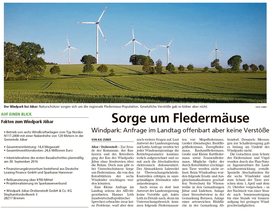 20200525 Altmark Zeitung - Drebenstedt - Windkraftanlagen und Fledermäuse (Kai Zuber)