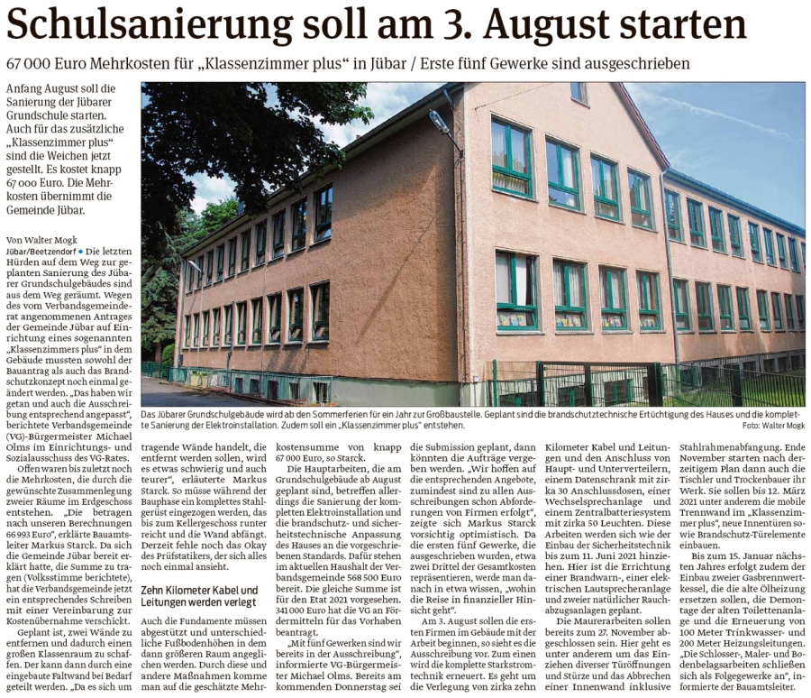 20200616 Volksstimme - Jübar - Grundchule - Schulsanierung beginnt am 3. August (Walter Mogk)