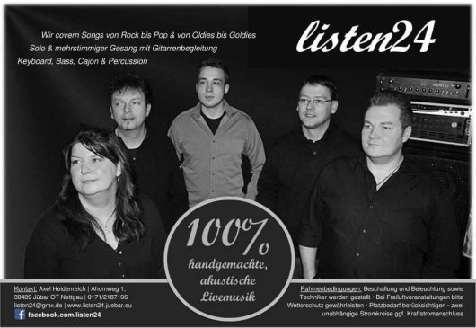 Torsten Schulz heißt der neue Bassist der Nettgauer Band 'listen 24'. In der Altmark ist der Musiker aus Rohrberg bekannt unter dem Pseudonym 'Molker'. Seit Mitte Februar 2014 steht 'Molker' für die 100% handgemachte akustische live-Musik der Band 'listen 24' als neues Mitglied zur Seite. Die Band covert Songs von Rock bis Pop und Oldies bis Goldies. Januar 2012 wurde 'listen 24' vom Gitarristen Axel Heidenreich ins Leben gerufen. Yvonne Heidenreich 'Yvi' (Gesang/Gitarre), Ronny Herms (Piano/Gesang) und Johannes Finger 'JoE' (Cajon/Percussion/Gesang) runden das musikalische Gesamtbild perfekt ab.