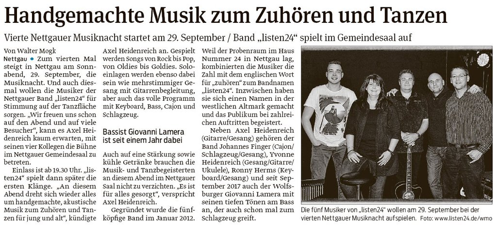 Die Nettgauer Band >listen24< bereitet ihr Konzert vor. Im September 2013 wird auf dem Dorfgemeinschaftssaal in Nettgau wieder Musik gemacht. Der Kartenvorverkauf findet ab Mai statt.