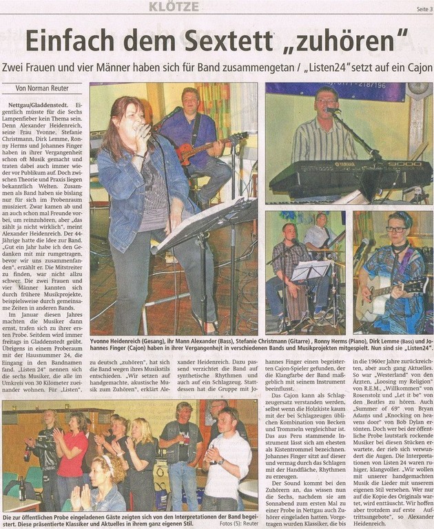 Nettgau - Mit Torsten Schulz (genannt 'Molker') als Bassist hat die Nettgauer Band 'listen 24' ein neues Mitglied gewonnen. In der Altmark ist der Musiker aus Rohrberg gut bekannt. Seit Mitte Februar 2014 steht 'Molker' für die 100% handgemachte akustische live-Musik der Band 'listen 24' zur Seite. Die Band covert Songs von Rock bis Pop und Oldies bis Goldies. Vor zwei Jahren wurde 'listen 24' vom Gitarristen Axel Heidenreich ins Leben gerufen. Yvonne Heidenreich 'Yvi' (Gesang/Gitarre), Ronny Herms (Piano/Gesang) und Johannes Finger 'JoE' (Cajon/Percussion/Gesang) runden das musikalische Gesamtbild ab. Nun wird für den nächsten öffentlichen Auftritt wieder fleißig in Gladdenstedt geprobt.