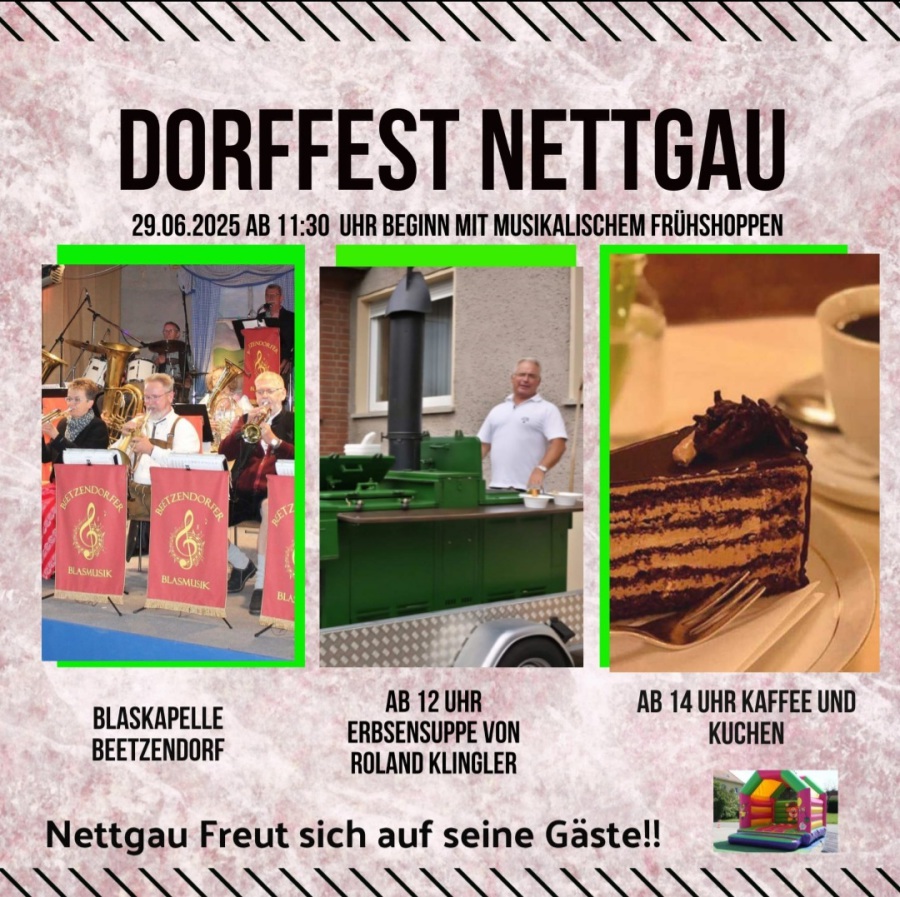 Nettgau - Die Senioren/innen der Gemeinde aus den Orten Gladdenstedt, Nettgau und Wendischbrome trafen sich auf Einladung des Ratsherren Kevin Rust und seinem Team (Basti Prehm & Ela Herbst, Ramona Rust sowie spontane Helfer aus den Reihen der Gäste) auf dem Nettgauer Dorfgemeinschaftssaal. Geboten wurden neben Getränken auch die sehnlichst erwarteten Torten und Blechkuchen mit Kaffee. Die Leckereien wurden allesamt von den Seniorinnen gebacken und gespendet. Pünktlich zur Mittagszeit baute Roland Klingler zusammen mit seiner Ehefrau Edda die angeheizte Gulaschkanone vor dem Saal auf. Die Erbsensuppe, mit oder ohne Bockwurst, fülltenicht nur den Magen der Erwachsenen, sondern auch der Kinder und Jugendlichen. Zum Toben der Jüngsten Gäste stand eine aufgeblasenen bunte Hüpfburg parat. Die stimmungsvolle musikalische Untermalung wurde von der Blaskapelle Beetzendorf geboten. Ausrichter des Dorffestes war die Seniorengruppe Nettgau.